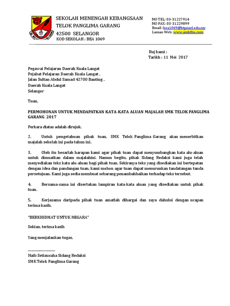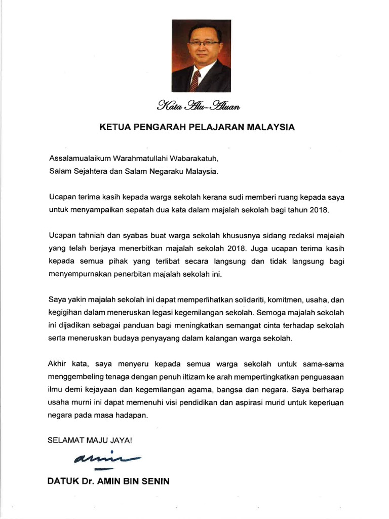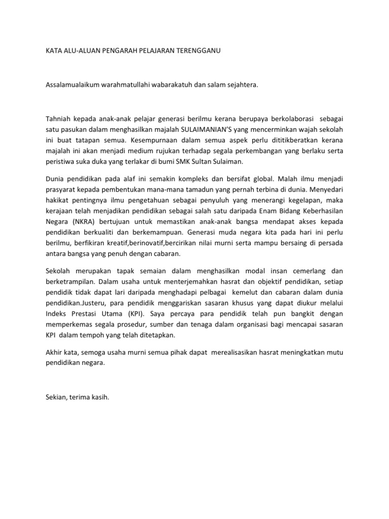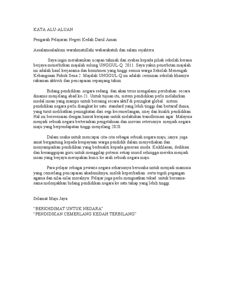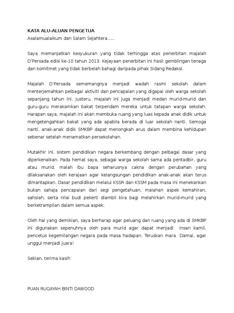 Setinggi-tinggi ucapan terma kasih saya tujukan kepada pihak sekolah kerana memberikan ruang kesempatan kepada saya untuk menyampaikan sepatah dua kata dalam Majalah Sekolah bagi Tahun 2015. Saya ingin merakamkan ucapan tahniah dan syabas kepada gabungan majlis guru be Related posts to kata alu aluan untuk majalah sekolah kata alu aluan untuk majalah sekolah 2019 08 23t191600 0700 rating. Assalamualaikum warahmatullahi wabarakatuh dan salam sejahtera.