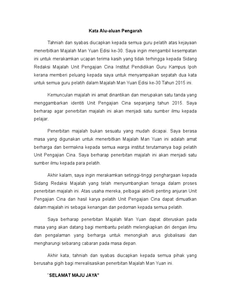 Kata Aluan Pengarah Untuk Majalah Sekolah 2016 Sek Men 1 Pdf. Kata-Kata Aluan Saya mengucapkan tahniah kepada pegawai-pegawai Kementerian Kesihatan Malaysia KKM yang telah berjaya mengeluarkan Kit Program Pengurusan yang mengandungi Prosedur Standard Standard Operating Procedure SOP bagi tugas-tugas pengurusan sumber manusia pengurusan kewangan perolehan khidmat pengurusan. Tahniah kepada pihak pengurusan dan ahli jawatankuasa laman web ini.